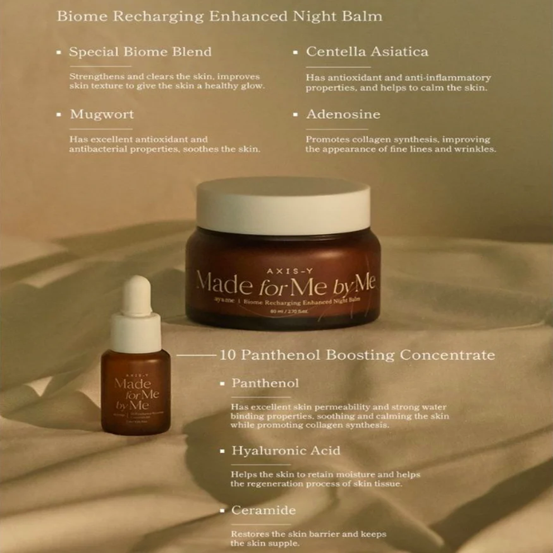 xAxis-Y Biome Recharging Night Renewal Set is a two-step nighttime skincare routine that helps recharge, soothe, and strengthen tired skin while you sleep. This set includes a silky concentrate and a rich night balm that work together for smoother, healthier skin by morning.