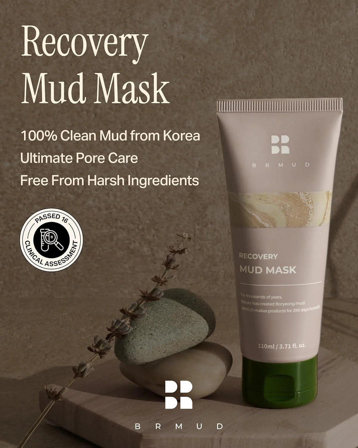 xThe BRMUD Recovery Mud Mask is a skincare product formulated to deeply cleanse and revitalize the skin. It contains 30% Boryeong mud powder, known for its rich mineral content and strong absorption properties, which effectively remove sebum and impurities from the pores This mask also includes soothing ingredients such as Centella Asiatica extract, fig extract, tea tree oil, and Eclipta Prostrata leaf extract. These components help calm irritated skin, provide antioxidant benefits, control oil, and reduce redness. The creamy texture of the mask ensures easy application and does not strip the skin of moisture, leaving it clean and hydrated after use. It has passed sensitive skin tests, making it suitable for delicate and sensitive skin types. Regular use of the BRMUD Recovery Mud Mask can help minimize pores, improve skin texture, and promote a clearer, more radiant complexion.